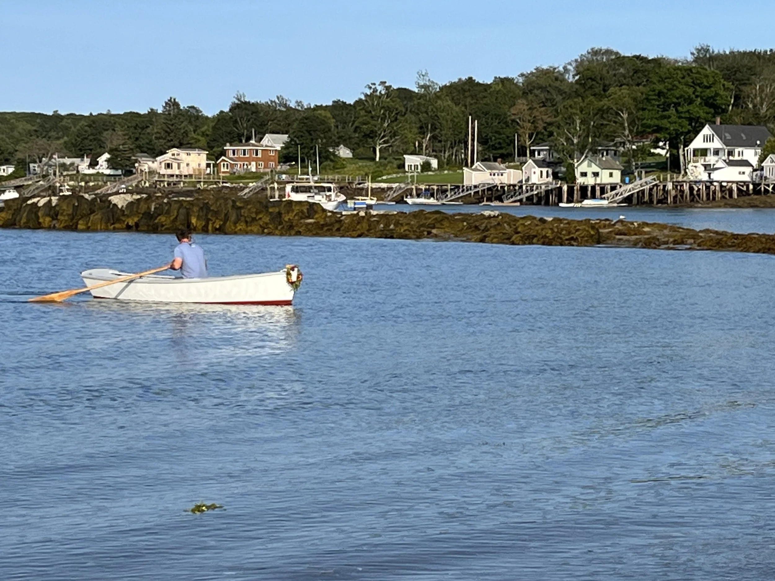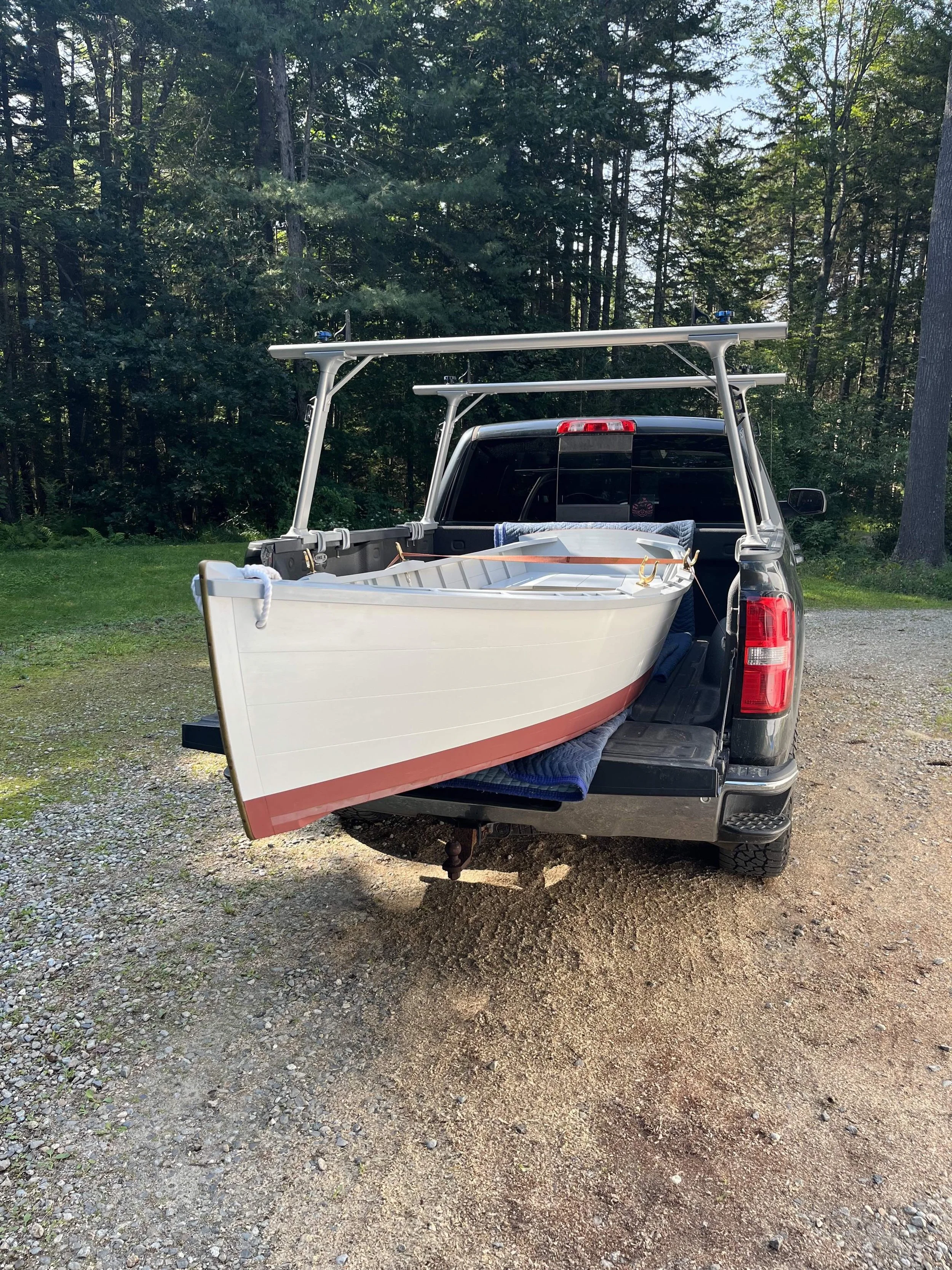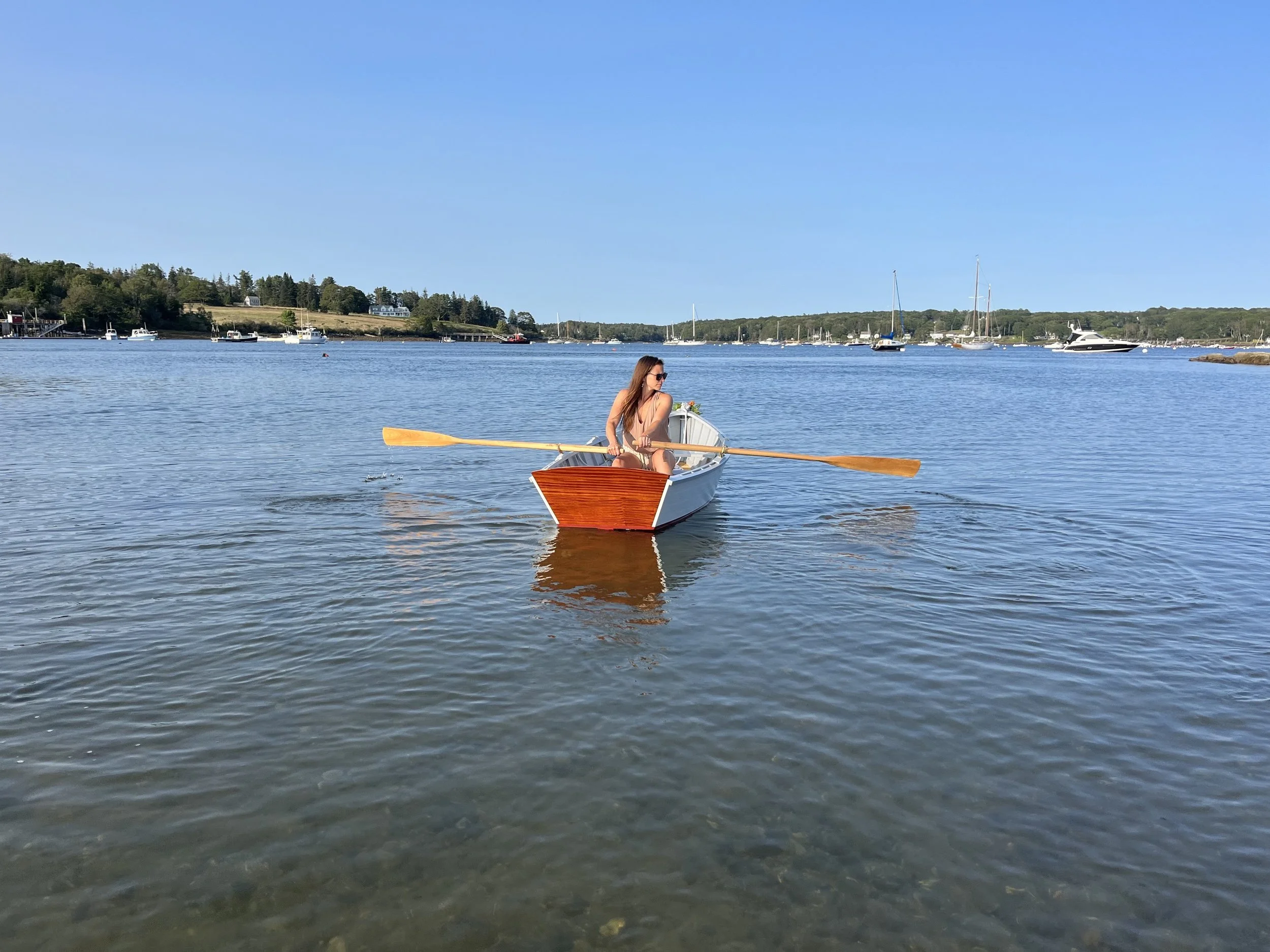 New traditionally built 11′ flat bottom skiff. Northern White Cedar bottom planking and Atlantic White Cedar side planking on White Oak chines, frames and stem with White oak plank keel, skeg, and runners as well. Sapele(African mahogany) transom and rail structure. Fastened with silicon bronze screws and copper rivets. Bottom planking was soaked with raw linseed oil to encourage greater stability over time. Finished surfaces are Kirby paint and LeTonkinois varnish. Has two rowing stations for trim and can carry 2-3 adults comfortably. This skiff would be great as a tender for a cruising boat or as a family boat to explore with and teach your kids how to row. Fits nicely in the back of a pickup truck